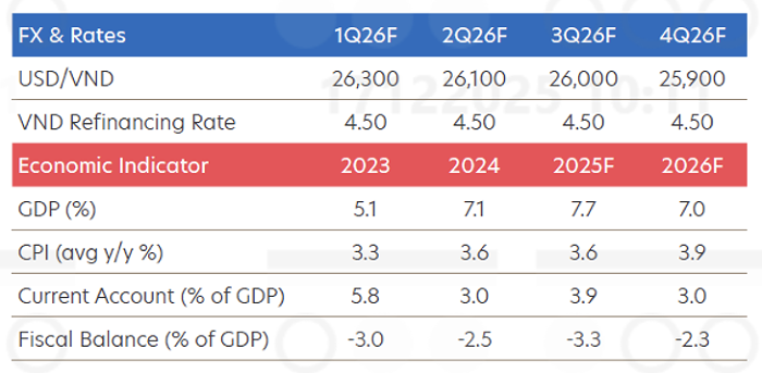 Theo đó, nhóm phân tích duy trì quan điểm thận trọng đối với VND, với dự báo tỷ giá USD/VND lần lượt ở mức 26.300 trong quý I/2026, 26.100 trong quý II/2026, 26.000 trong quý III/2026 và 25.900 trong quý IV/2026.