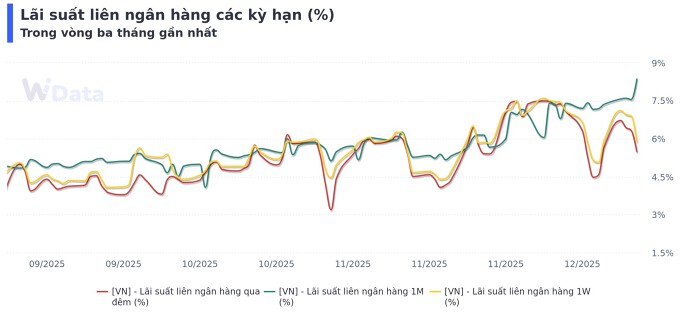 Bên cạnh đó, tại phiên 25/12, lãi suất kỳ hạn một tuần hiện ở mức 5,87%; kỳ hạn hai tuần là 8,72%; kỳ hạn một tháng là 8,38% và kỳ hạn ba tháng là 7,82%, tăng cao so với mức đầu tuần.