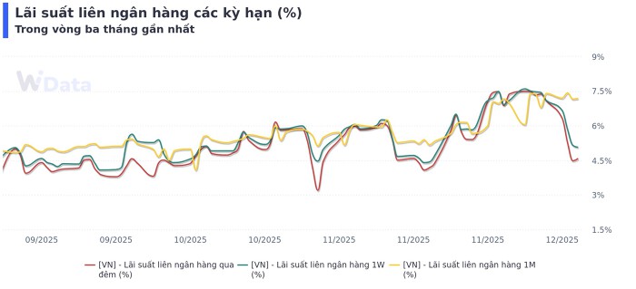 Trong tuần trên thị trường liên ngân hàng, lãi suất kỳ hạn qua đêm giảm mạnh, bắt đầu từ mốc 6,32% vào đầu tuần và giảm dần qua các phiên, xuống 4,48% trong phiên 17/12, trước khi tăng nhẹ lên mức 7,58% tại ngày 18/12.