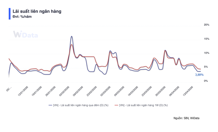 Trước đó, lãi suất liên ngân hàng tăng mạnh vào cuối tháng 3 sau khi NHNN tăng rút ròng và nhu cầu vốn tăng cao vào cuối quý. Tuy nhiên, áp lực thanh khoản vẫn khá cao tại các ngân hàng thương mại khi tăng trưởng tín dụng vẫn ở mức cao hơn nhiều so với tăng trưởng huy động.