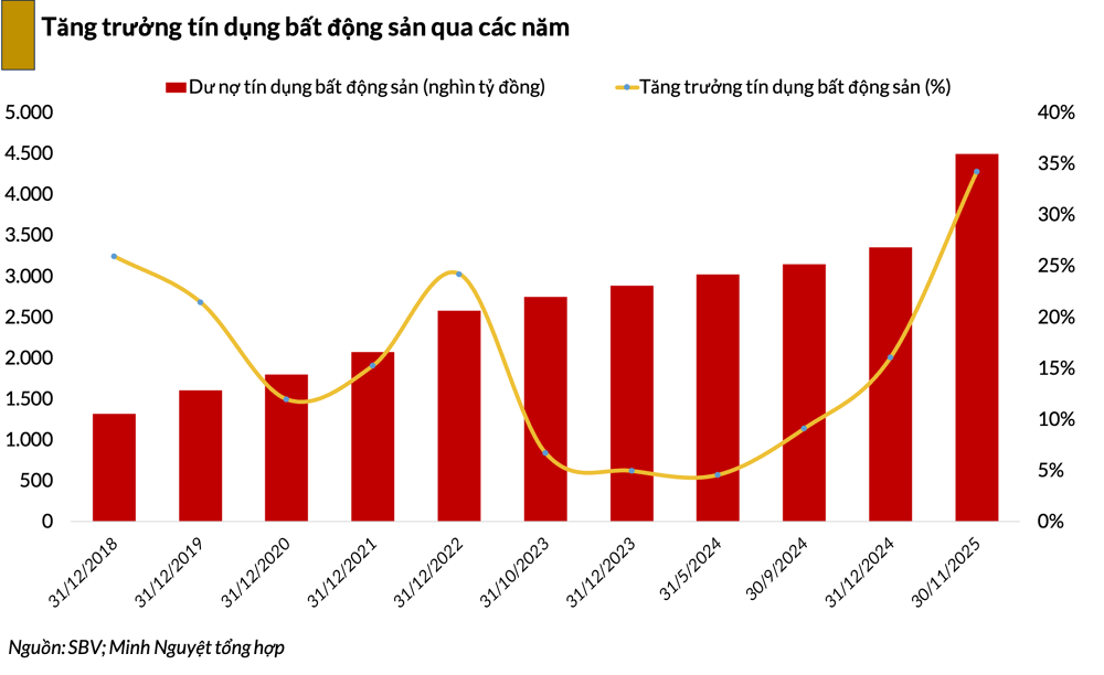 Tính đến cuối tháng 11/2025, tổng dư nợ cho vay bất động sản đạt khoảng 4,5 triệu tỷ đồng (tăng khoảng 34,3% so với mức 3,35 triệu tỷ đồng cuối năm 2024), tương đương 24,8% tổng dư nợ của toàn hệ thống (theo VTV dẫn số liệu từ Ngân hàng Nhà nước).