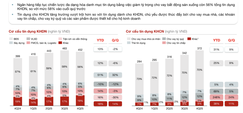 Mặc dù giảm về tỷ trọng nhưng cho vay tổ chức của Techcombank vẫn ghi nhận tăng trưởng hai chữ số về giá trị tuyệt đối. Dư nợ tính đến hết năm 2025 đạt 411.429 tỷ đồng, tăng 14,5%. Trong đó, cho vay kinh doanh bất động sản tiếp tục là lĩnh vực chiếm tỷ trọng lớn nhất với 207.027 tỷ đồng, chiếm tỷ trọng 28,6% (giảm từ 30,88%).