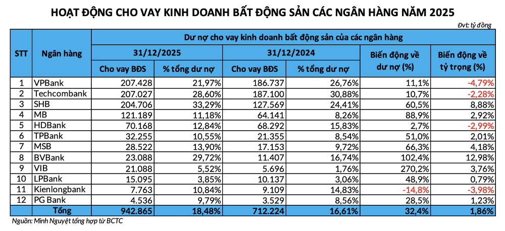 Tỷ trọng cho vay lĩnh vực này tại những ngân hàng trên cũng tăng từ 16,61% vào cuối năm 2024 lên 18,48% vào cuối quý IV/2025, cho thấy các ngân hàng vẫn đang tích cực bơm vốn cho lĩnh vực bất động sản. Tuy nhiên, danh sách thống kê có 4 nhà băng ghi nhận giảm tỷ trọng cho vay kinh doanh bất động sản trong năm 2025 bao gồm VPBank (giảm 4,79 điểm %), Kienlongbank (giảm 3,98 điểm %), HDBank (giảm 2,99 điểm %) và Techcombank (giảm 2,28 điểm %)