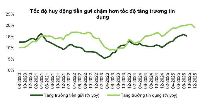 Tình trạng tín dụng tăng nhanh hơn huy động tiếp diễn đang tạo áp lực lớn lên thanh khoản hệ thống ngân hàng đầu năm 2026, đẩy lãi suất huy động tăng, buộc các ngân hàng vào cuộc cạnh tranh gay gắt về vốn, đồng thời gây khó khăn cho việc giảm lãi suất cho vay.