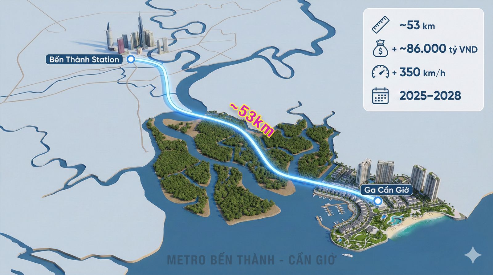 Mới đây, lãnh đạo TP.HCM cho biết tuyến đường sắt tốc độ cao Bến Thành – Cần Giờ sẽ khởi công vào ngày 19/12/2025. Tuyến dài hơn 53 km, tốc độ thiết kế 350 km/h, tổng vốn đầu tư hơn 3 tỷ USD, do tư nhân đề xuất và kết nối trực tiếp trung tâm thành phố với Cần Giờ